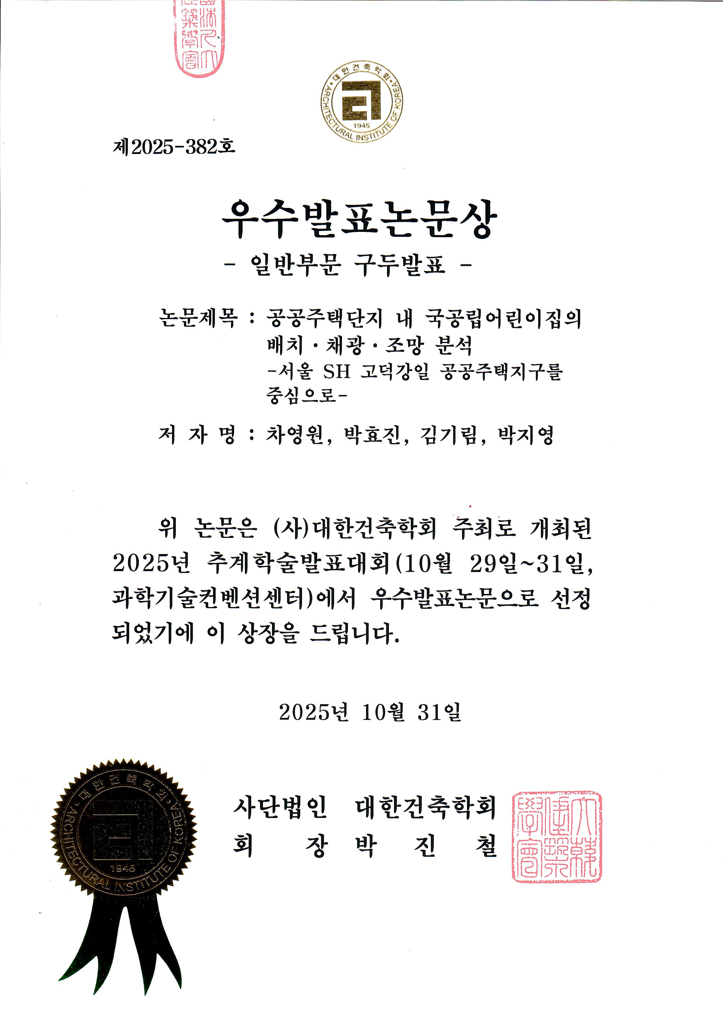 - 우수논문발표상 (차영원, 박효진, 김기림, 박지영), 공공주택단지 내 국공립어린이집의 배치·채광·조망 분석- 서울 SH 고덕강일 공공주택지구를 중심으로, , 대한건축학회 추계학술대회, 서울, 2025.10